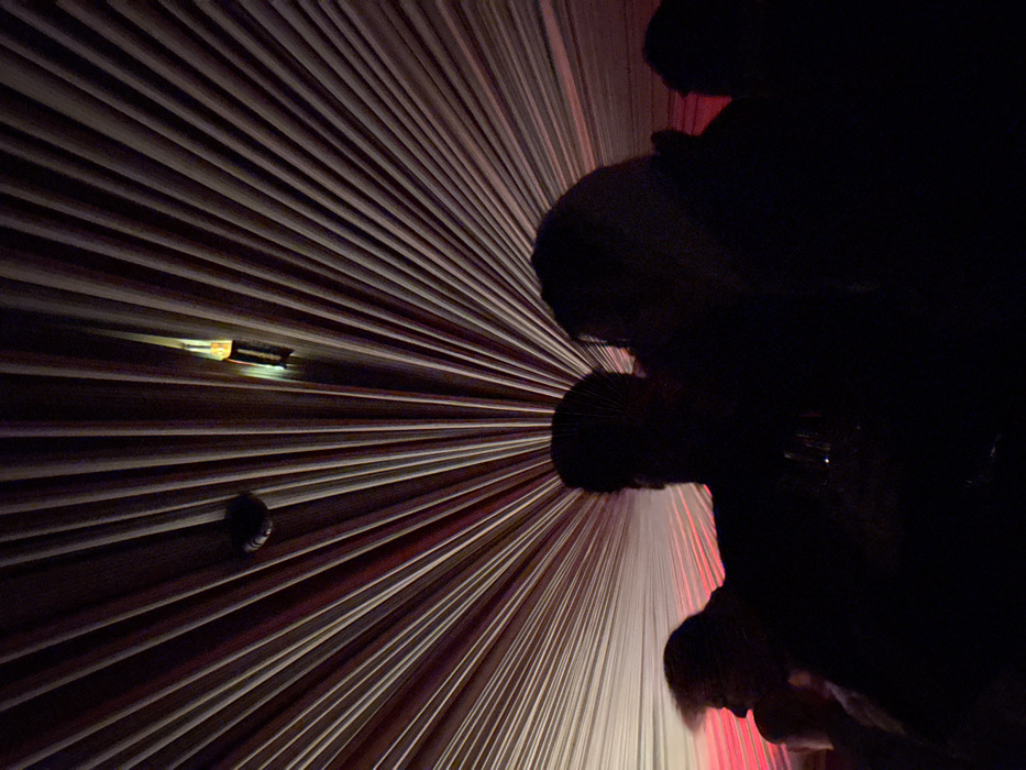 A tilted perspective reveals a wall-like structure composed of numerous horizontal slats radiating from a central point. A small light fixture is visible between the slats. The right side of the image is dominated by silhouetted figures against a dark background, with only the faint outline of their heads discernible. The overall lighting is dim, creating a sense of enclosure.