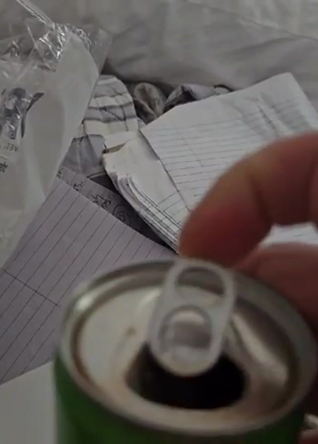 A hand is shown holding a can of V8 Spicy Hot 100% Vegetable Juice. The can has already been opened, and the hand is tapping the pull tab to make a noise. The background is a pile of miscellaneous items including paper, a plastic bag, and striped fabric.