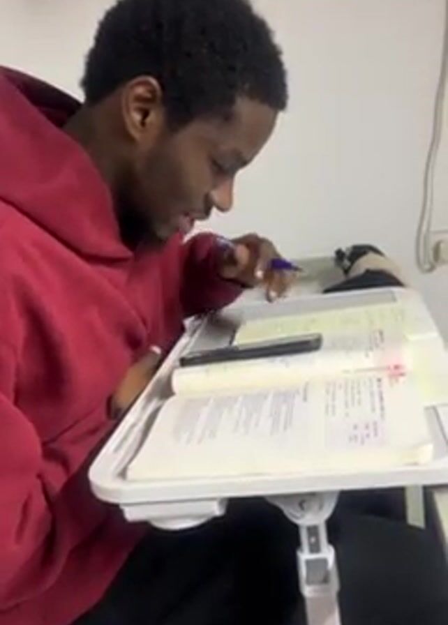 A medium shot captures a young, dark-skinned man with short, curly hair, engrossed in studying while seated on a bed