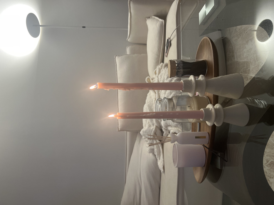 The image depicts an indoor scene, likely a living room, at an undetermined specific location in New York, United States. The foreground features a glass-top coffee table holding a wooden tray. On the tray are two lit pink taper candles in white decorative holders, a white ribbed container, a white diffuser bottle with reed sticks, a clear glass jar containing a lit candle, and a small glass bottle with a cork stopper filled with dark-tipped matches. In the background, a light-colored upholstered sofa with multiple cushions and a light-colored throw blanket is visible. A dark object, possibly a smartphone or remote, rests on the sofa. To the upper right, a modern white floor lamp with a large, circular illuminated head provides additional light. No people are present, and no specific actions or interactions are depicted. The overall environment is illuminated by the candles and the floor lamp, suggesting a dim, possibly evening, setting.
