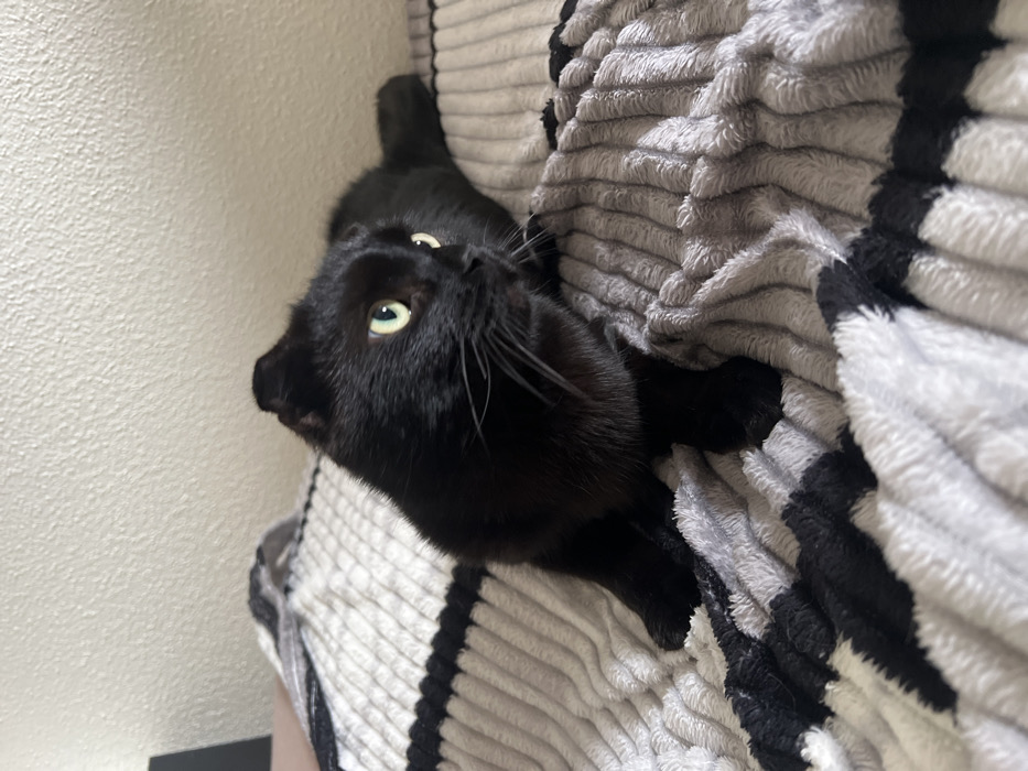- "A black domestic cat is depicted indoors, lying on a textured blanket with alternating horizontal stripes of light grey and black" by FM-DC28B3, licensed under CC BY 4.0