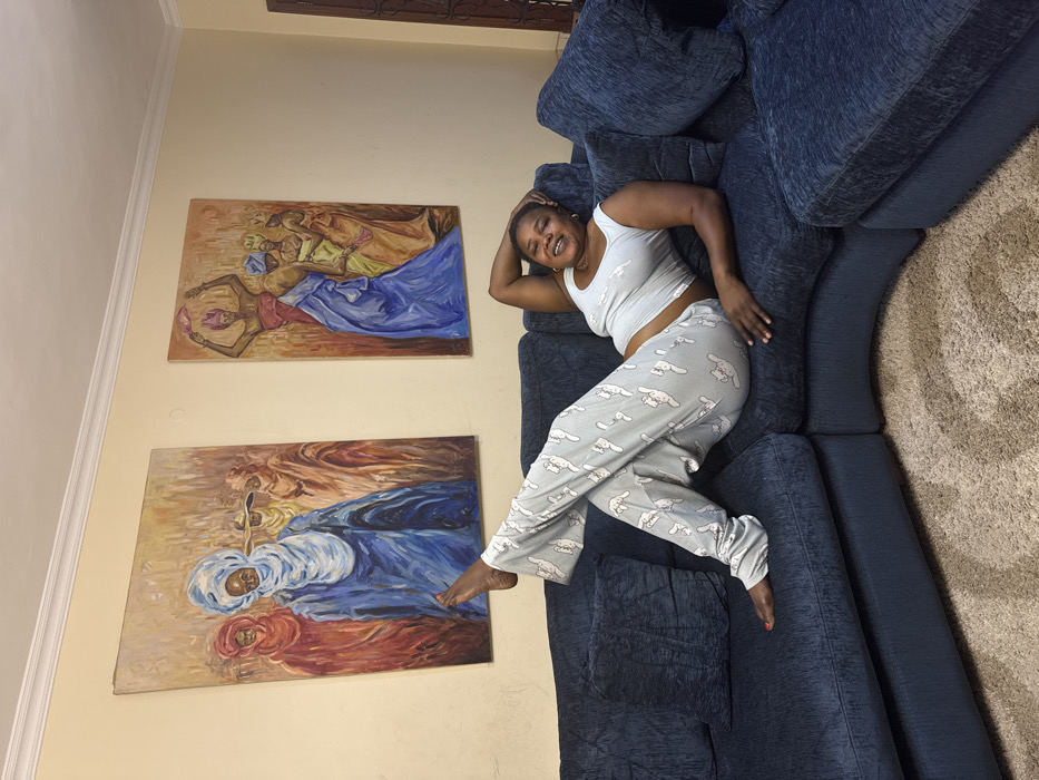 A woman lounges on a dark blue, modular sofa with numerous cushions, her head resting on her hand. She wears a light-colored pajama set patterned with cartoon characters. On the wall behind her are two paintings depicting figures draped in colorful cloth, primarily blue and reddish-brown hues. Part of a beige rug is visible on the right side of the frame. The wall is painted in a light tan color.
