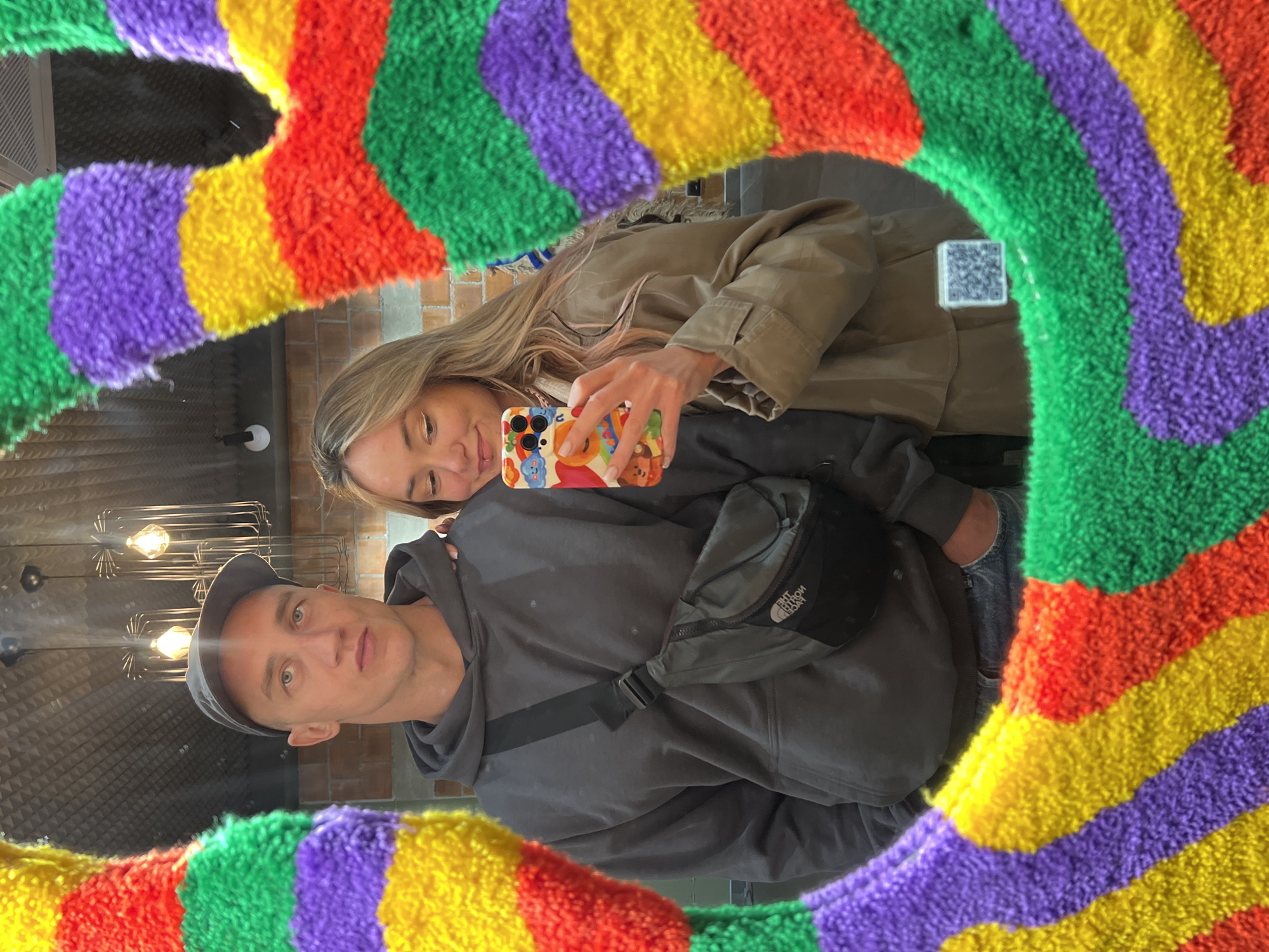 A man and woman are taking a selfie in a mirror decorated with rainbow-colored faux fur, indoors in Budva, Montenegro