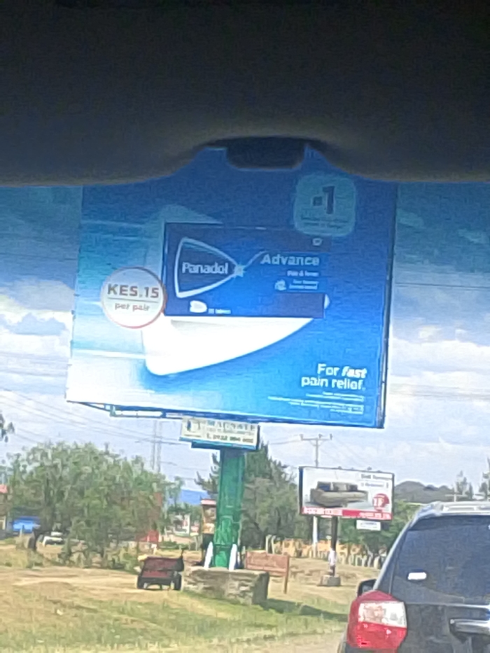 This image, captured from within a vehicle looking forward, depicts a roadside environment in an unidentified city within Kenya. A large blue and white billboard, prominently advertising "Panadol Advance" at "KES. 15 per pair" and stating "For fast pain relief," is positioned in the mid-ground to the left, supported by a green pole structure. A "1" ranking icon is visible on this main billboard. Further back and to the right, a smaller billboard advertises a sofa. The rear portion of a dark-colored vehicle, displaying red taillights, occupies the lower right foreground, suggesting it is directly in front of the camera's vantage point. On the unpaved ground in the mid-left, a small, red, two-wheeled trailer or cart is visible. Scattered trees and bushes populate the mid-ground and background, alongside visible utility poles and power lines. The sky is partly cloudy. No individuals are distinctly visible in the scene.