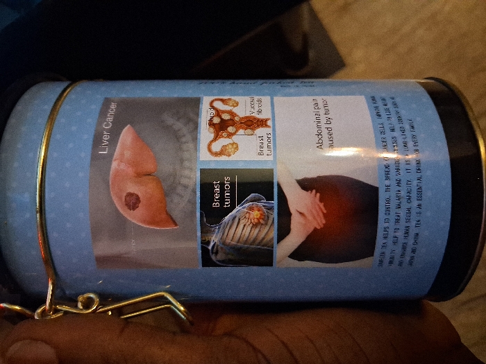 A close-up, slightly angled photograph taken in the city of Donga, Nigeria, shows a dark-skinned left hand gripping a light blue, cylindrical metal container. The container features a gold-colored wire clasp on its left side and is adorned with a multi-paneled label. The top panel displays an illustration of a human liver with a dark lesion, captioned 'Liver Cancer.' Below this, the label features two adjacent panels: the left shows an anatomical illustration of a female torso highlighting breast tissue with a visible mass, labeled 'Breast tumors.' The right panel illustrates a female reproductive system (uterus and ovaries) with multiple growths, labeled 'Uterine fibroids' (partially visible) and 'Breast tumors' positioned alongside the uterus diagram. The bottom panel depicts a person's hands clasped over a reddened lower abdomen, captioned 'Abdominal pain caused by tumors.' Below these images, promotional text for 'SANFEGN TEA' states it 'HELPS TO CONTROL THE SPREAD OF CANCER CELLS, IMPROVE HUMAN IMMUNITY, HELP TO TREAT MALARIA AND VARIOUS DISEASES, HELP TO LOSE WEIGHT AND ENHANCE HUMAN SEXUAL CAPACITY. IT IS A LONG-LIVED COUNTRY SUCH AS JAPAN AND CHINA. TEA IS AN ESSENTIAL DRINK FOR EVERY FAMILY.'