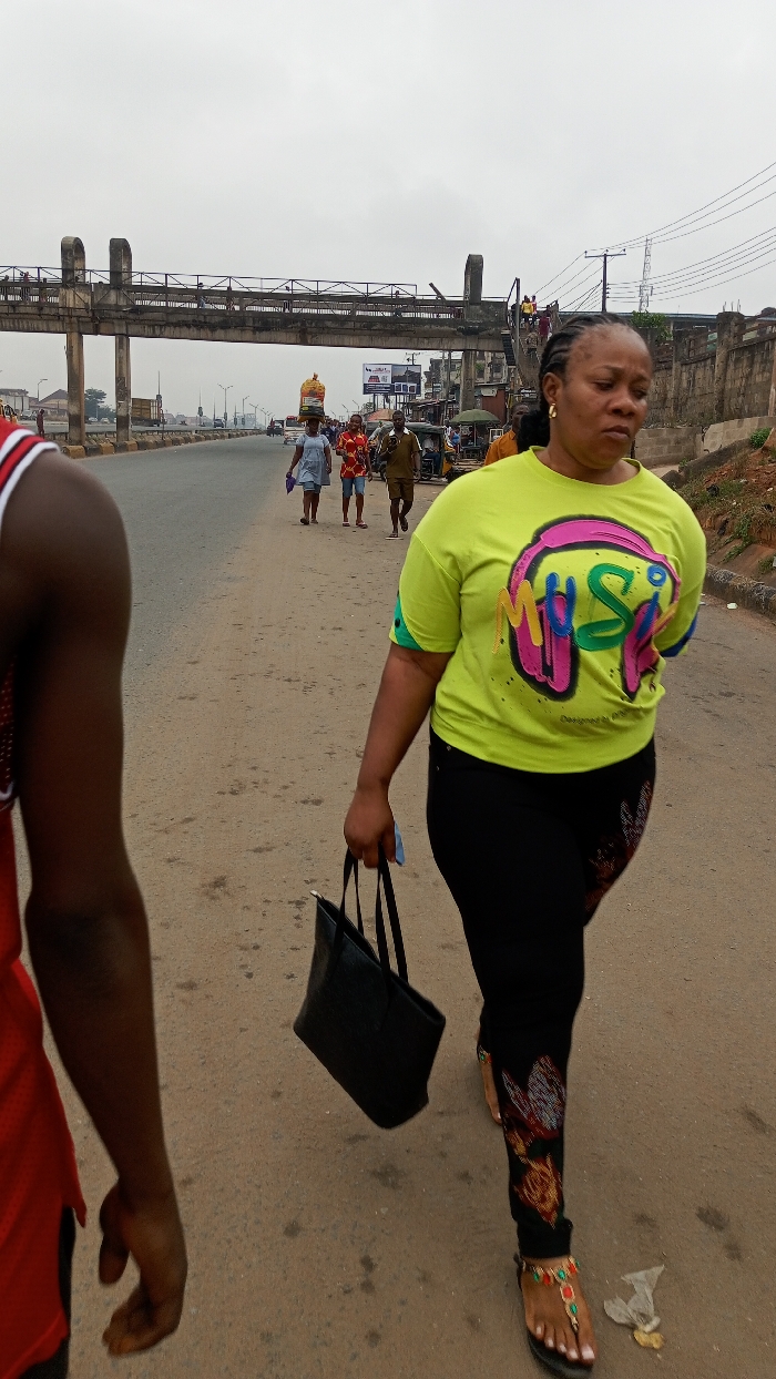 The image depicts an urban street scene in Onitsha, Nigeria, under an overcast sky. In the immediate foreground on the left, the dark-skinned upper arm and a segment of a red and white sleeveless top of an individual are visible. To the right and slightly behind this individual, an adult female walks forward on a discolored, paved road. She wears a neon green short-sleeved t-shirt with a multi-colored graphic of headphones and the word "MUSIC," black full-length leggings featuring a reddish-brown pattern near the ankles, gold hoop earrings, and ornate black toe-ring sandals embellished with red, green, and gold. Her hair is dark and styled in braids. She carries a black handbag in her right hand. The road surface exhibits dirt and scattered debris, including a crumpled white item near the female's right foot. In the middle ground, a concrete pedestrian overpass with two prominent arched supports spans the multi-lane road. Several individuals are visible on the overpass. On the road beneath the overpass, multiple pedestrians walk in the same direction, including one person carrying a large, yellow-wrapped object on their head, another in a light blue garment, and others in casual attire. Vehicles, including cars and what appears to be a tricycle, are present on the road further in the distance. To the right of the road, a concrete barrier separates the road from a row of low-rise buildings and commercial structures. A large billboard with advertising content is also visible on the right side of the road. Numerous overhead power lines are visible against the light grey sky throughout the scene.