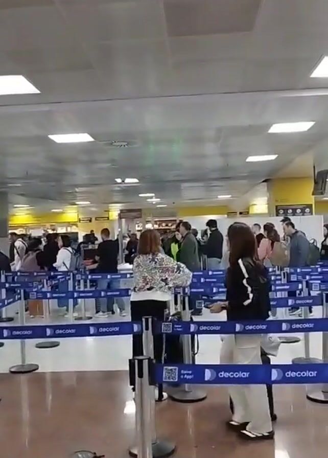 crowded airport check-in area. Many people are standing in queues demarcated by blue stanchions labeled "decolar." Individuals are pulling luggage, walking, and waiting in line. The environment is a brightly lit, modern airport interior with a low, flat ceiling containing recessed lighting. Some passengers are wearing masks. The background features check-in counters, monitors displaying information, and other airport personnel.