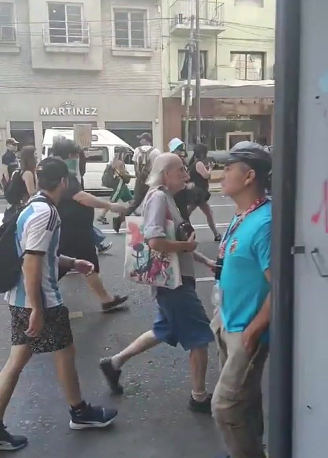 group of people walking down a city street in Argentina. Most of the people are walking from left to right across the street. They are walking in small clusters with varying speeds. Some are carrying items like bags or a rolled-up object. Some people wear casual clothes like shorts and t-shirts, while others wear all-black outfits. Some individuals carry flags. In the background, there is a street with buildings on both sides and parked cars. A white van with the word "MARTINEZ" on the side is visible behind the pedestrians. The camera is behind a doorway or similar structure with graffiti on it. There is a man in a light blue t-shirt standing in front of the camera on the right. In the first seconds, a man shouts, "Milei" and another one responds "Afuera".