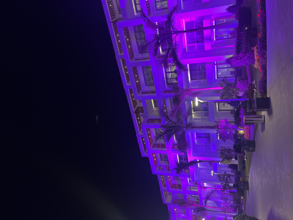 A tall, modern building with multiple stories is lit with vibrant purple lights at night. The architecture features stacked, rectangular balconies with a white frame. Palm trees stand in front of the building, also illuminated in purple. The night sky is dark, creating a stark contrast with the brightly lit building and foliage. Potted plants and other greenery adorn the base of the building. The image is rotated to the right, giving a tilted perspective.