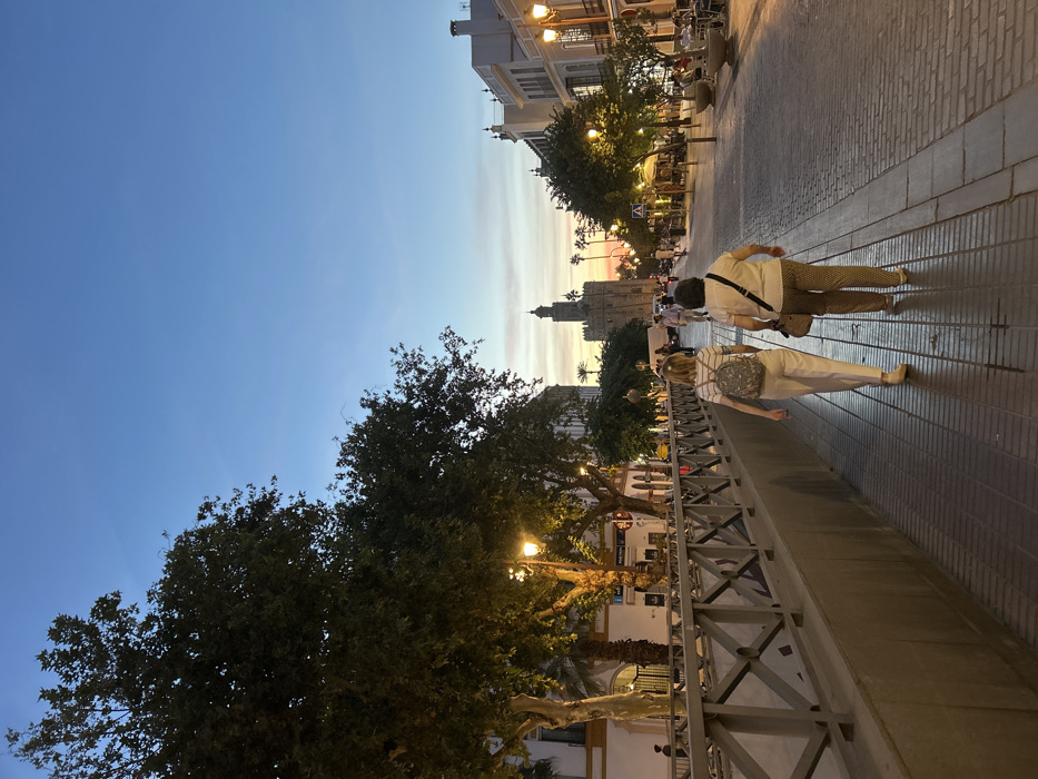 The image displays a pedestrian street scene at dusk in Sevilla, Spain, oriented towards the Torre del Oro
