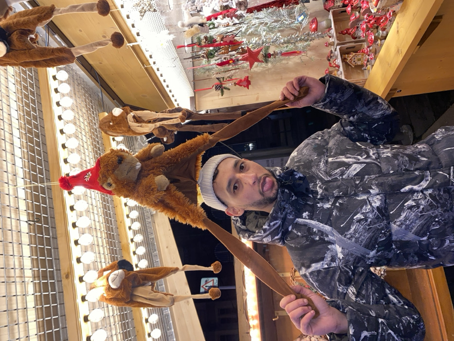 A man wearing a white beanie and a camo-patterned jacket playfully sticks out his tongue while holding the dangling straps of a novelty monkey hat. The hat, worn by a stuffed monkey with a red winter cap, is suspended alongside other similar hats. A display of Christmas decorations is visible in the background, featuring ornaments, a decorated tree, and overhead lighting. The setting appears to be an outdoor market or event.
