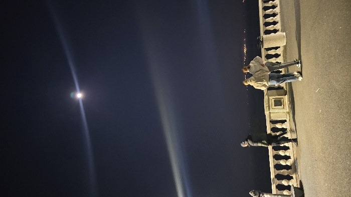 The image depicts a nighttime scene on a coastal promenade in Burgas, Bulgaria. A prominent moon is visible in the dark upper sky, accompanied by a distinct diagonal lens flare extending across the frame. On the paved promenade, three individuals are present. To the left, a male subject, dressed in a dark jacket, dark trousers, and a dark cap, walks towards the left side of the frame with his back partially to the camera. To the right, two female subjects stand with their backs fully to the camera, positioned at a light-colored stone balustrade. Both females wear light-colored hooded sweatshirts and jeans, and appear to be looking out over the body of water beyond the balustrade. Beyond the balustrade, a dark expanse of water, presumably the Black Sea, is visible, with faint, scattered lights on a distant horizon. Objects present on the promenade include a coin-operated telescope mounted on a pedestal on the far left, adjacent to the balustrade, and a cylindrical concrete trash receptacle positioned on the far right. The promenade itself is illuminated by an unseen artificial light source, casting soft shadows.