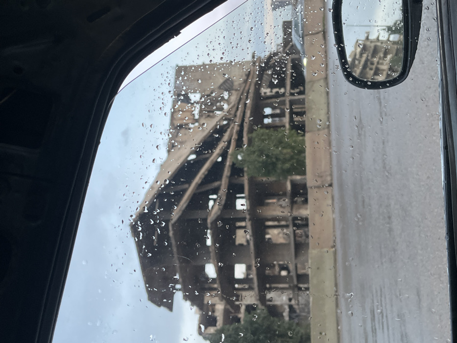 - "The image displays a severely damaged, multi-story concrete building located in Joubar Municipality, Syria, viewed from the interior of a vehicle through a rain-splattered side window" by FM-WnN6r1, licensed under CC BY 4.0
