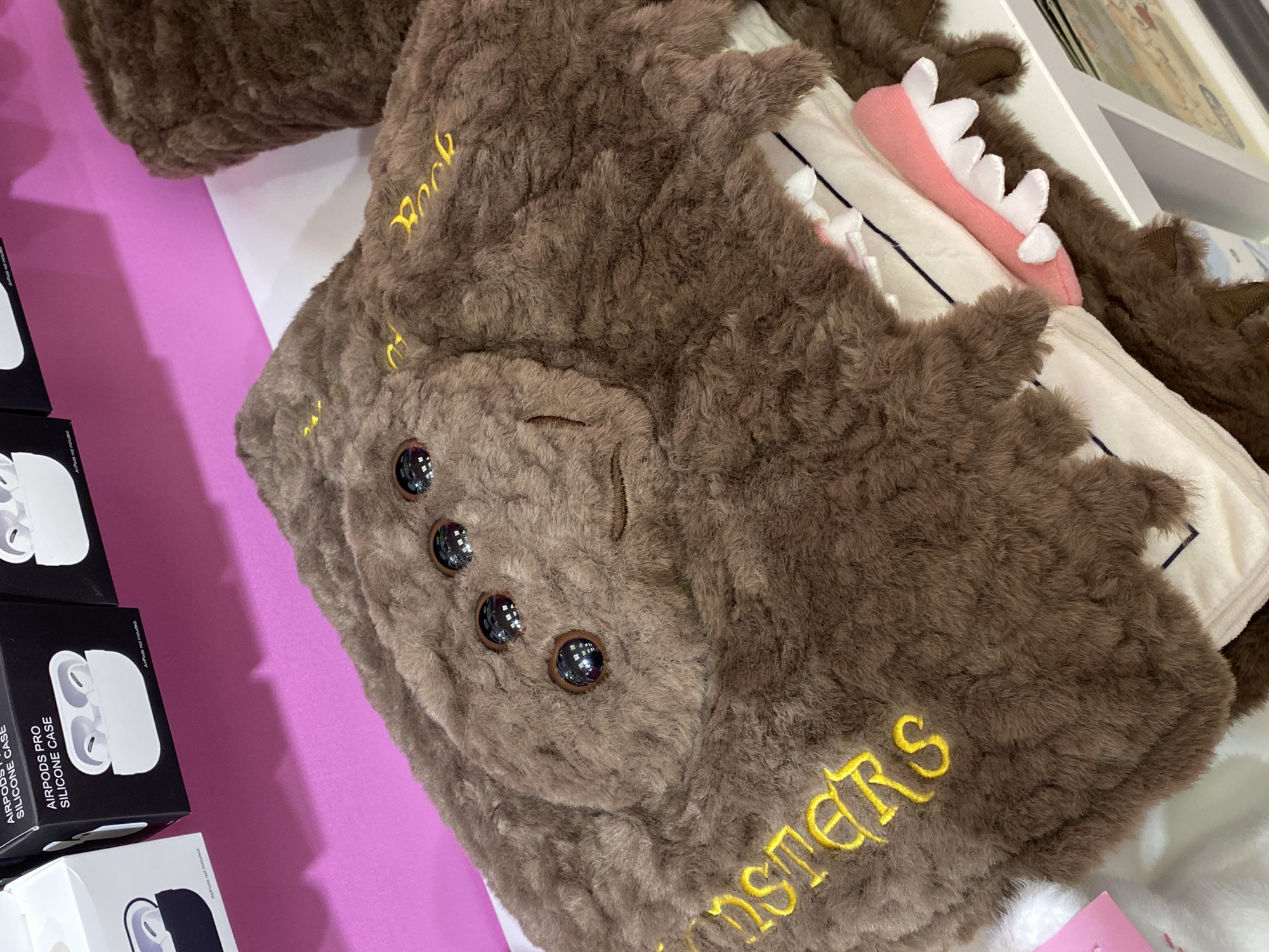 A close-up shows a furry, brown, monster-like plush object with four shiny button eyes, yellow embroidered text "Book Monsters", and a pink and white tongue sticking out, resting on a surface; a stack of black "AirPods Pro Silicone Case" boxes is to the left