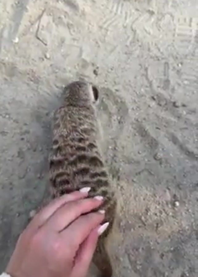 A video shows a person petting two animals. The person, wearing a light colored sweater and sporting white nails, first pets a meerkat standing on light sand or dirt. The person then moves on to pet a Capybara on the head. The Capybara stands on the same ground as the Meerkat.
