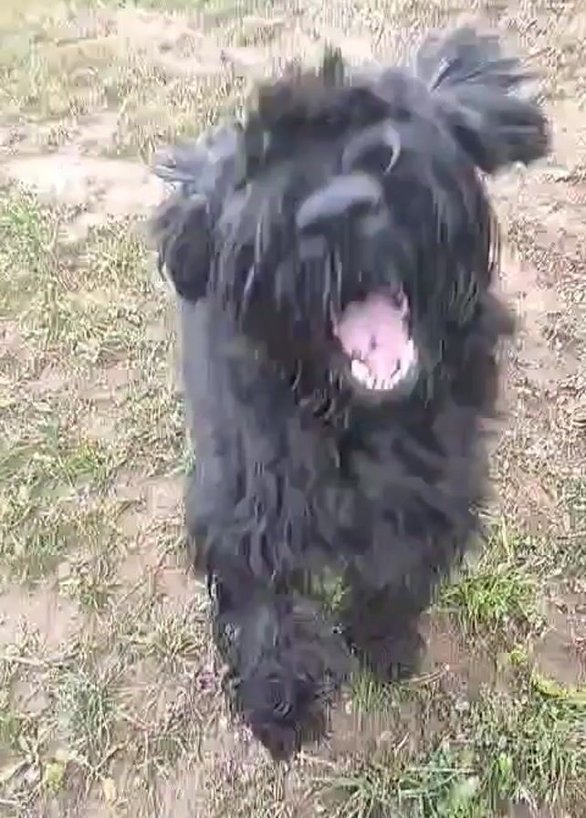 large, black dog with long, shaggy fur panting and standing on grassy ground. The dog looks up towards the camera, barking. A hand, likely belonging to a person off-screen, reaches out and gently strokes the dog's back.