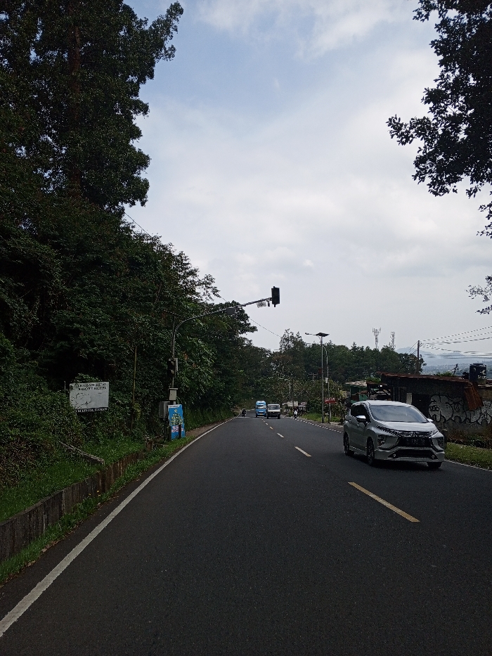 The image displays a two-lane asphalt road in Ciloto, Indonesia, under an overcast sky