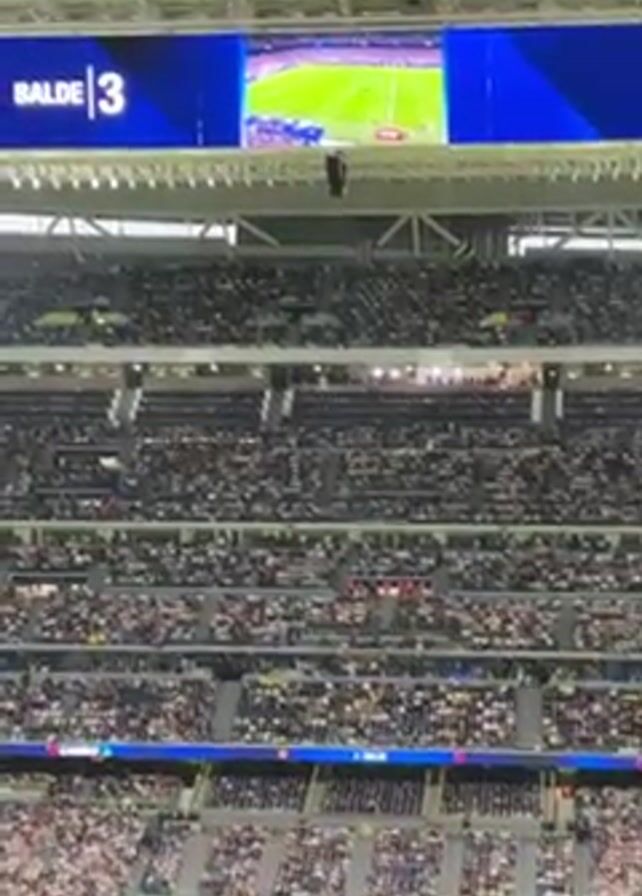 A packed stadium is shown with a big screen displaying replays of the soccer/football game taking place on the field