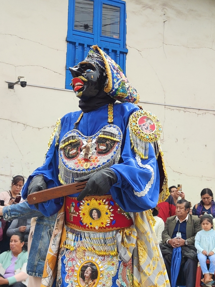 A person wearing an elaborate, culturally specific costume stands in front of a building. The costume features a dark-colored mask with exaggerated facial features, a blue tunic adorned with ornate decorations, and a decorative headdress. The individual holds a wooden spatula-like object. An audience watches, some taking photos with their phones. A blue window and a security camera are visible on the building in the background.