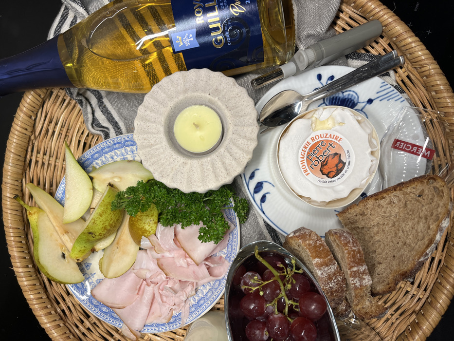 A woven basket holds a variety of gourmet snacks. A bottle of "Royal Guiliderre" cider sits beside a lit candle. A blue-patterned plate contains sliced pears, ham, and parsley. Adjacent, another plate holds a round of "Fromagerie Rouzaire Pierre Robert" cheese in its wooden container, along with a spoon. A plastic-wrapped item and slices of crusty brown bread complete this plate. A small metal bowl features a cluster of red grapes. A gray striped towel adds texture to the basket's arrangement.