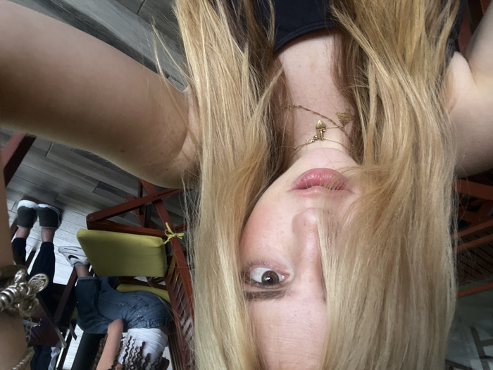 A blonde woman takes a selfie in an upside-down perspective. Her face, neck, and shoulders are prominent. She wears a delicate necklace. The background includes a wooden floor, a green cushioned chair, and a table. Reflected in the surface are two people; one is wearing jeans, white sneakers, and a white shirt with braided hair, and the other is wearing shorts and black sneakers.