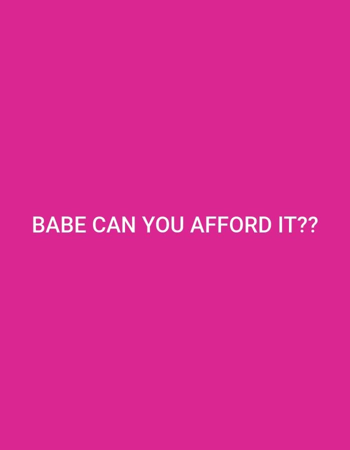 A pink background dominates the image. The text "BABE CAN YOU AFFORD IT??" is prominently displayed in white, centered horizontally and vertically. The font is plain and legible. The text is clearly a question, suggesting a concern about financial ability or affordability. The overall tone is playful, due to the use of "BABE," but the underlying message implies a financial query or hesitation.