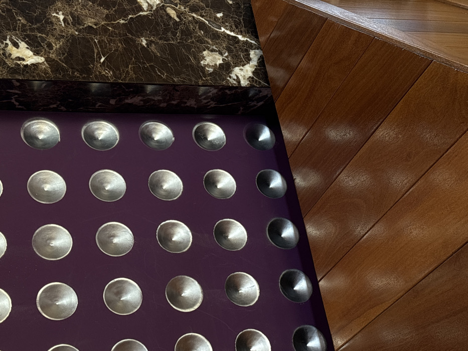 This image depicts an abstract close-up of architectural and interior design elements within a location in Playa del Carmen, Mexico. The scene is dominated by three distinct material surfaces. On the left, a vertical, deep purple surface is regularly patterned with numerous silver-colored, conical studs, each reflecting light. Adjacent to this, on the right, a dark brown marble column or panel is visible, characterized by intricate white and cream-colored veining and a polished finish. Below these vertical elements, a polished wooden surface, likely a countertop or bench, extends diagonally across the bottom of the frame. This surface consists of medium-brown wooden planks laid at an angle, exhibiting a high gloss and reflective quality. No individuals, actions, or direct interactions are visible.