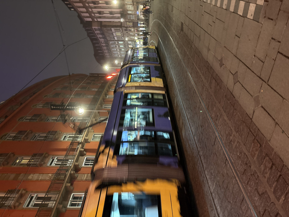 The image depicts a nighttime urban scene at Place de l'Homme de Fer in Strasbourg, France, identifiable by the "MAISON ROUGE" building visible on the left. A tram, colored primarily blue with yellow accents, is captured in motion, exhibiting significant blur, as it travels along a set of tracks laid into a cobblestone street. The tram's interior is illuminated, revealing indistinct figures of passengers. To the left, a prominent, multi-story building with a reddish-orange facade features numerous rectangular windows and balconies with dark railings. A vertical sign bearing the text "MAISON ROUGE" is affixed to this building. Several streetlights with bright illumination are positioned along the street. To the right, a paved sidewalk runs parallel to the tram tracks. Further into the background, a street curves to the right, lined with additional multi-story buildings, lighter in color and featuring numerous illuminated windows. Several pedestrians are visible on the sidewalks in the mid-ground and background, appearing as silhouettes or blurred figures due to the low light and distance. Overhead wires associated with the tram system are visible against the dark, overcast sky. The overall scene is lit by a combination of artificial streetlights, building illumination, and the tram's interior lights.