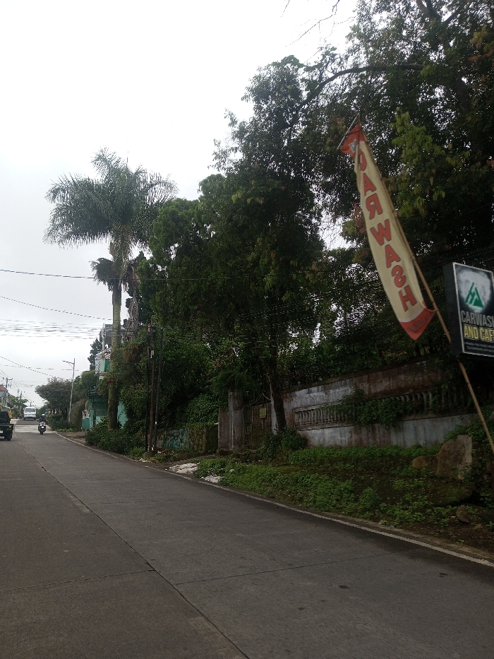 A street scene features a gray road leading into the distance, with a motorcycle approaching. On the right side is a partially obscured "CAR WASH AND CAFE" sign, accompanied by a flag displaying "CARWASH" vertically. Lush greenery lines the roadside, and a tall palm tree stands further away on the left. Utility poles and wires are visible, and the sky is overcast. A wall and various trees create a dense backdrop to the scene.