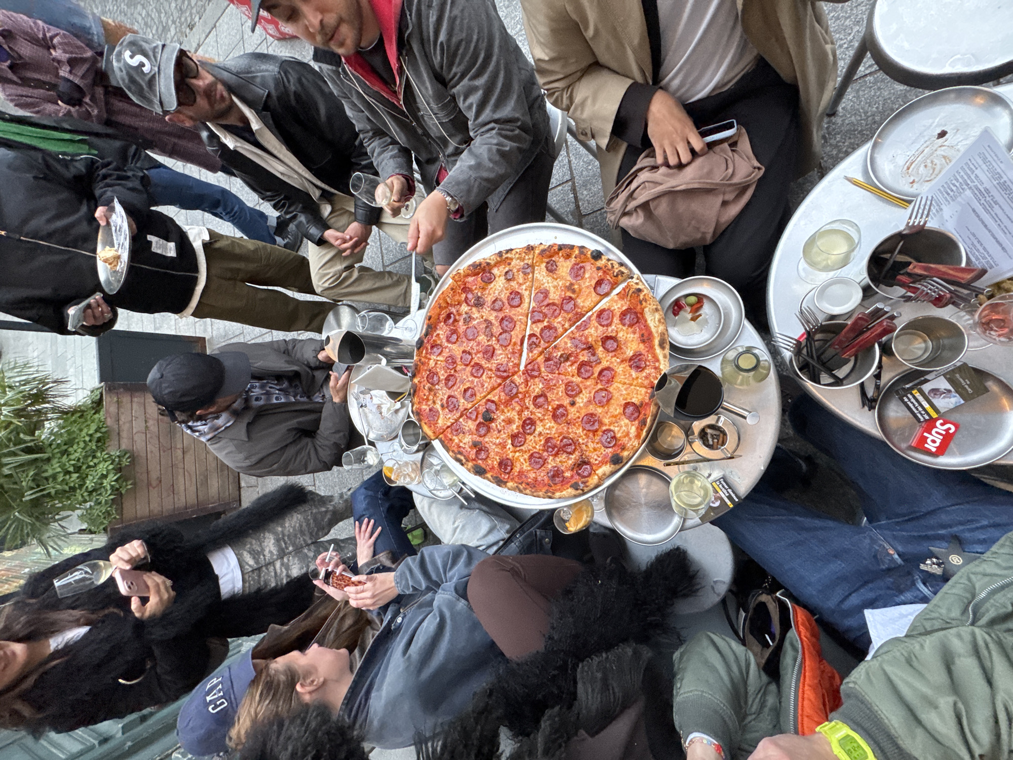 top-down view of a gathering around two round tables. On the first table, a large pepperoni pizza is prominently displayed, with a person cutting a slice. Several people are seated around the table, some holding drinks and plates. On the second table, there are empty plates, glasses, cutlery, and a menu. A "Supreme" sticker is visible on one of the plates. The clothing worn by the individuals suggests a casual, urban setting. The presence of French branding on some objects indicate the city of Paris, France.