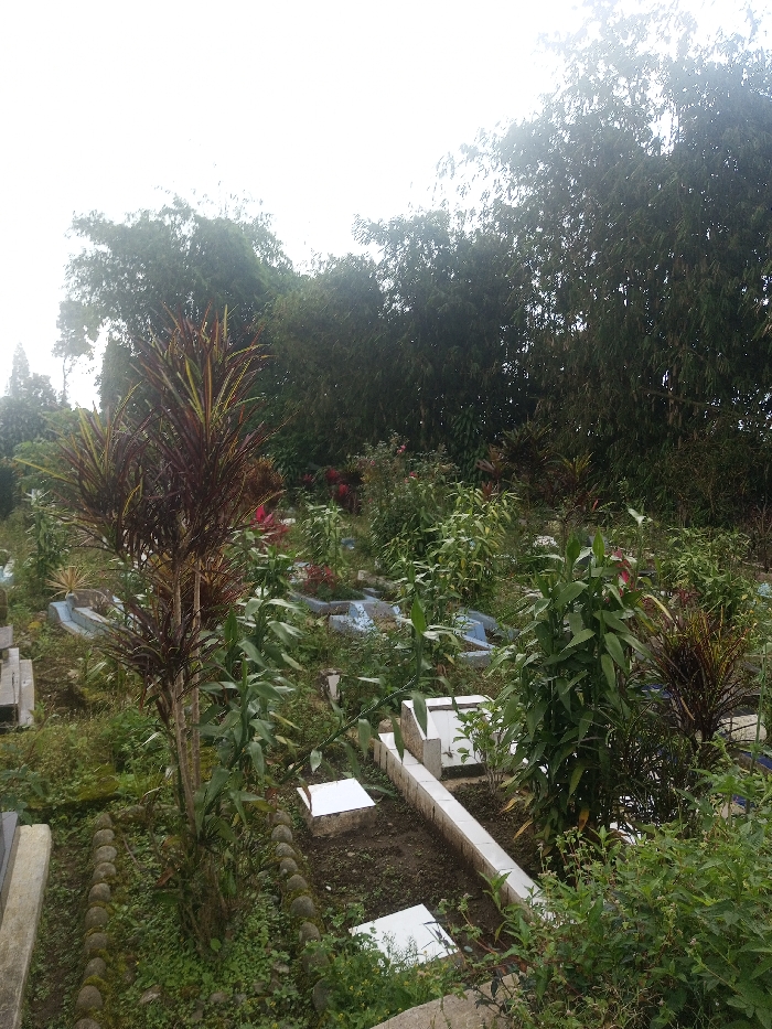 A cemetery scene under a hazy sky. Overgrown vegetation surrounds aged gravestones, creating a slightly wild and unkempt ambiance. Some graves feature light-colored stone borders or markers, while others blend with the landscape. Trees stand densely in the background, adding to the somber and somewhat melancholic mood.
