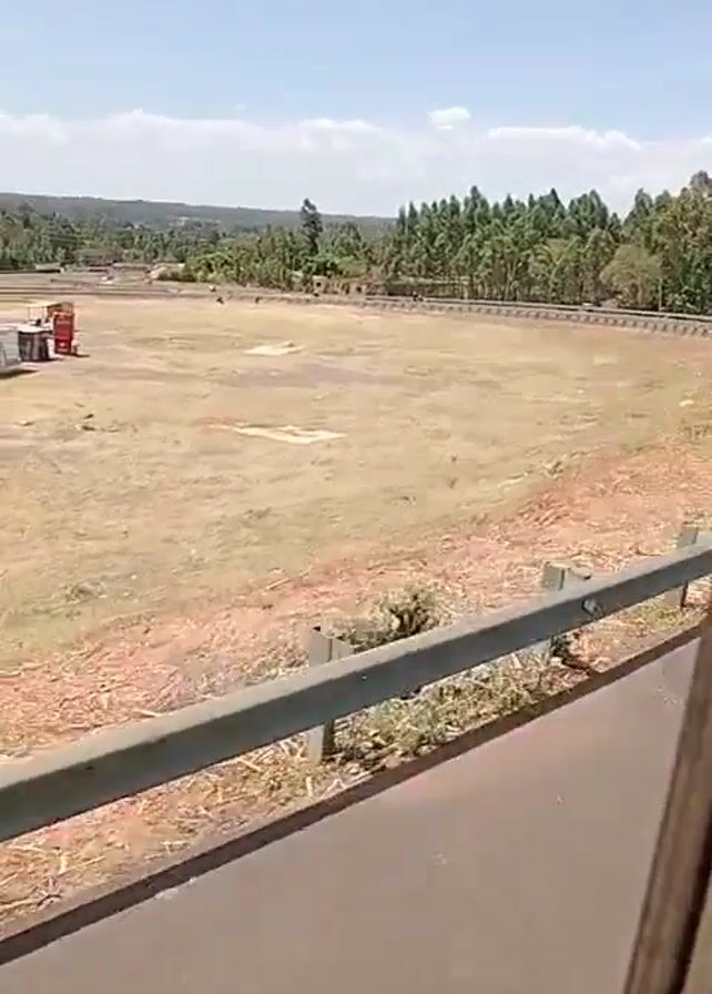 view from inside a moving vehicle, looking out a window. The vehicle is traveling on a paved road with a metal guardrail beside it. Beyond the guardrail is a large, mostly barren field with patches of dry grass and red soil. In the distance, a line of trees borders the field, and a blue sky with scattered clouds is visible above. There are shipping containers parked in the field. The window frame of the vehicle is dark and partially obscures the view. The day appears bright and sunny.
