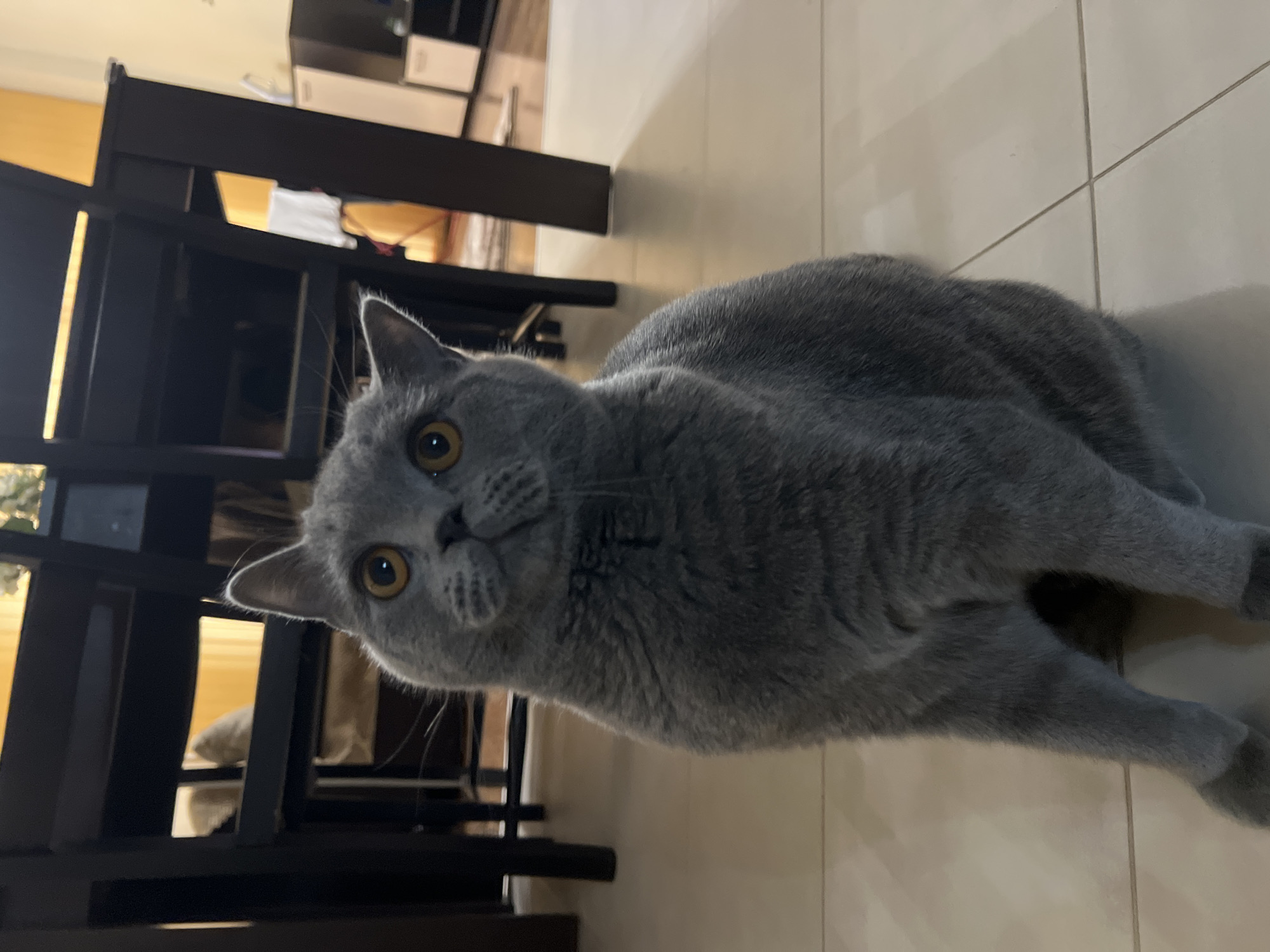 An indoor photograph captures a blue-grey British Shorthair cat positioned centrally on a light-colored, reflective tiled floor. The cat sits upright, its front paws tucked, facing slightly to the left and upwards, with wide, attentive amber-orange eyes. Its fur is uniformly dense and short. In the background, dark wooden dining chairs or similar furniture items are visible, partially obscuring a warm yellow-orange wall section and additional dark and light-colored cabinets or household furnishings. The floor consists of square, light-toned tiles with visible grout lines. The scene is illuminated by artificial light, consistent with a private residence in Sofia, Bulgaria.