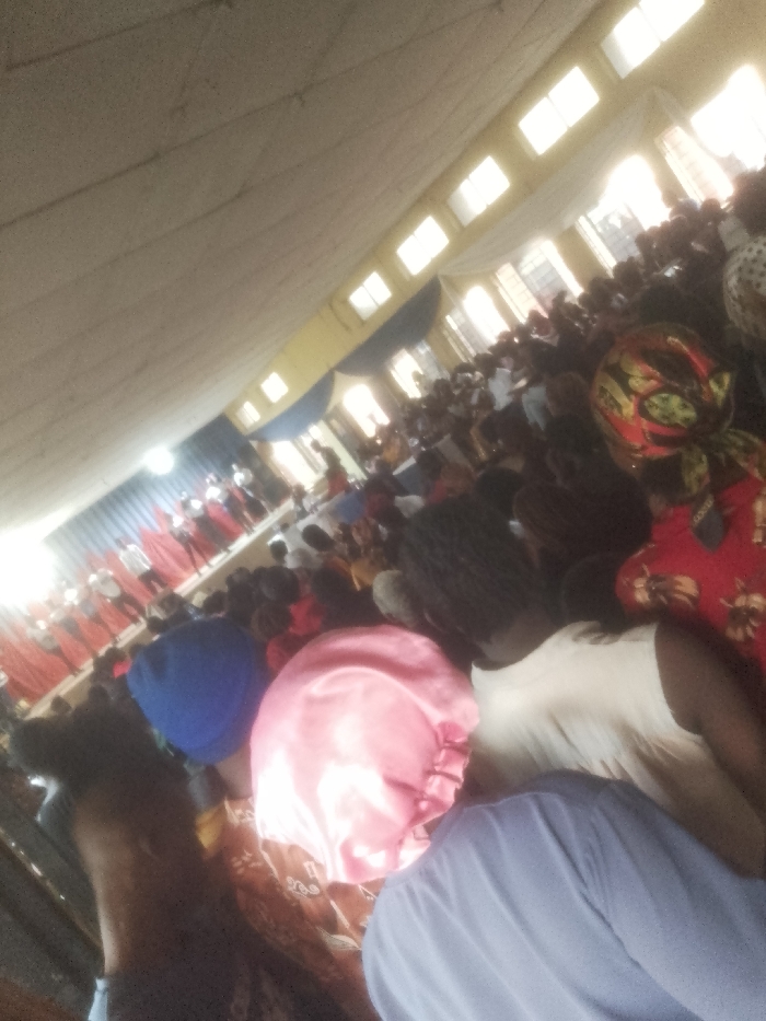 This image captures a large indoor gathering in Nsugbe, Nigeria, from an elevated, tilted perspective looking towards a stage or front area