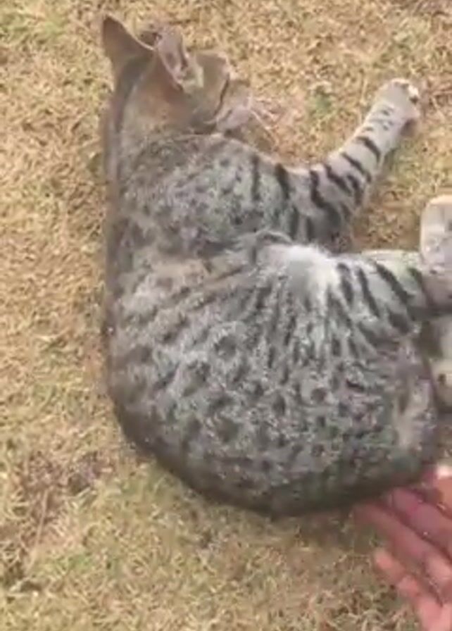 A person pets a tabby cat lying on its back on grass. The cat is mostly gray with darker gray stripes and spots. The person’s hand is dark-skinned. The grass is mostly brown with patches of green. The cat stretches out its paws and swishes its tail as it is petted.