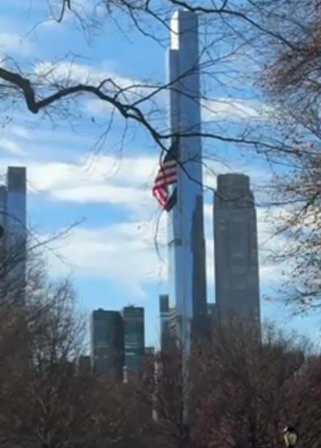 view from a park, likely Central Park, of the New York City skyline. In the foreground, bare tree branches frame the scene. The American flag is visible, waving in the wind. In the background, several skyscrapers are visible against a blue sky with scattered clouds. The central, prominent building is a tall, slender glass skyscraper. Other buildings of varying heights and architectural styles are also visible.
