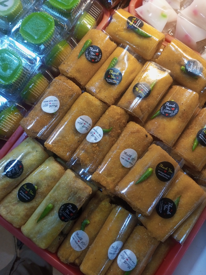 The image displays a close-up, elevated view of an assortment of individually packaged Indonesian snacks, likely on a market stall or vendor display in Cipanas, Indonesia. The central focus is on numerous elongated, rectangular items, characteristic of *risol*, which are arranged densely in rows within a red tray. Each *risol* is wrapped in clear plastic and many feature a small, circular "Thank You" sticker, some white with black text ("Thank You FOR YOUR ORDER") and others black with white text ("Thank You For Supporting My Small Business"). A single, small green chili pepper is visibly tucked under the plastic wrap on top of many of these items. In the upper left portion of the frame, several square and dome-shaped green snacks are visible in clear plastic containers. To the upper right, other lighter-colored, possibly white or translucent, food items are also present in clear plastic packaging. No individuals are visible. The scene suggests a commercial food display.