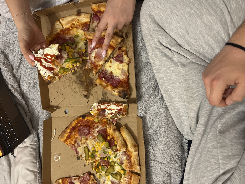 The scene depicts an indoor domestic setting, presumably in Shumen, Bulgaria. An overhead perspective shows an open, rectangular, corrugated cardboard pizza box resting on a textured grey blanket or bedding. A dark-colored laptop with an illuminated keyboard is partially visible in the upper-left, situated on a white pillow or sheet. Inside the pizza box, multiple slices of pizza are arranged. A large portion of one pizza type features salami, corn kernels, and sliced green pickles. Another section of pizza exhibits salami and cheese, with some slices also containing ham or bacon. Grease stains and sauce residue are visible on the cardboard. Two individuals are actively engaging with the pizza. A female's right hand, with manicured nails painted in light pink with glitter accents and wearing a thin bracelet, holds a large pizza slice from the upper-right section of the box. This slice is heavily topped with white sauce and drizzled with a red sauce, overlaying corn and pickles. A second female's hand, with similarly manicured nails, forms a "V" sign over a different pizza slice within the box, near the center-right. Below these hands, a male's left hand rests on a pair of grey sweatpants, wearing a thin black wristband. The overall impression is a casual meal taking place on a bed or sofa.