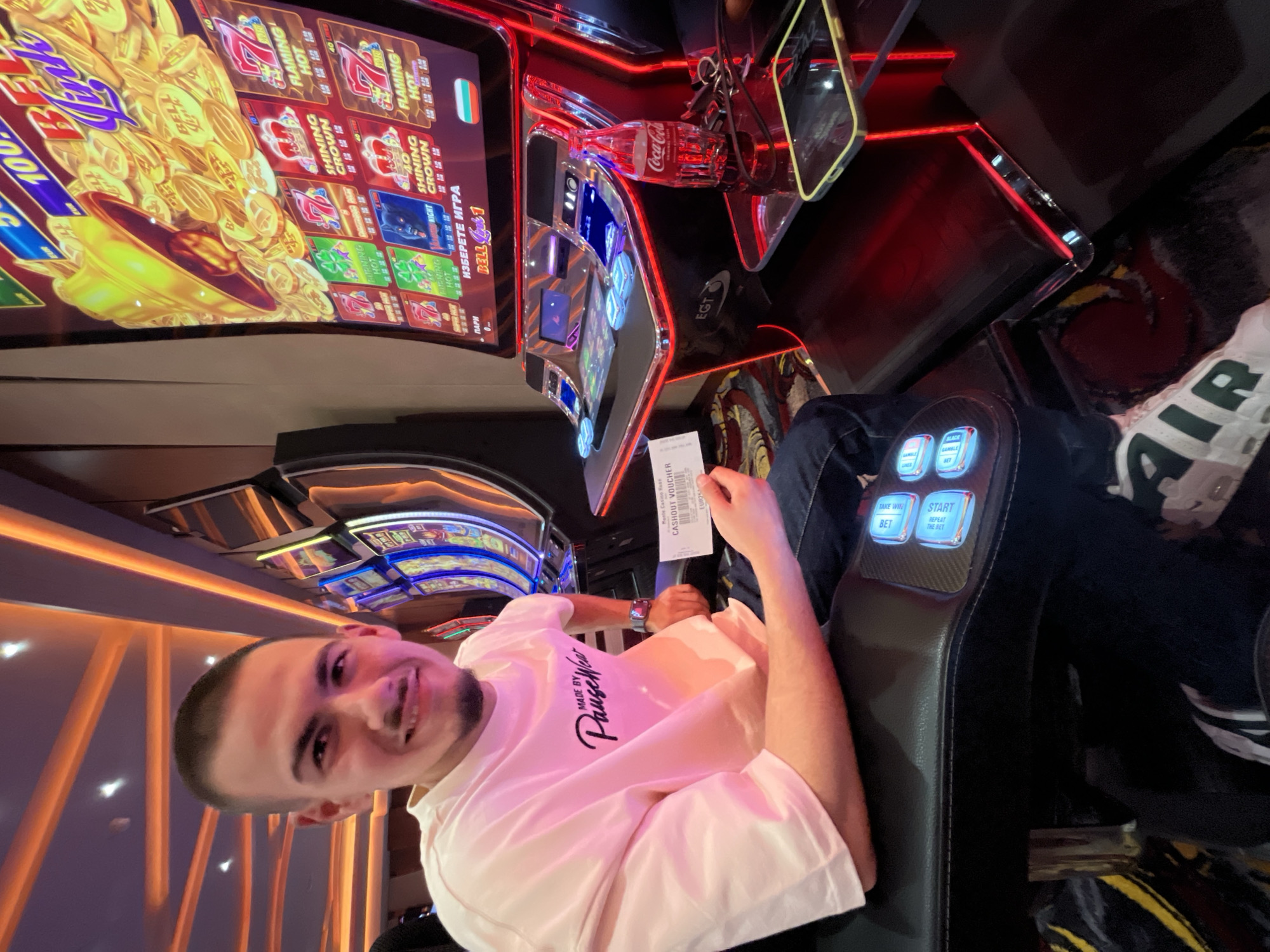 A young man sits at a slot machine inside a casino. He smiles and holds a printed voucher in his right hand. The slot machine displays gold coins and fruit symbols. A Coca-Cola bottle and a cell phone sit on the machine. The machine’s branding includes “EGT”. The voucher contains the phrase "Monte Casino Ruse", indicating the location is Ruse, Bulgaria. The man wears a white t-shirt with the word “PauseWear” on it, dark jeans and black-and-white sneakers. The machine’s buttons indicate betting options.