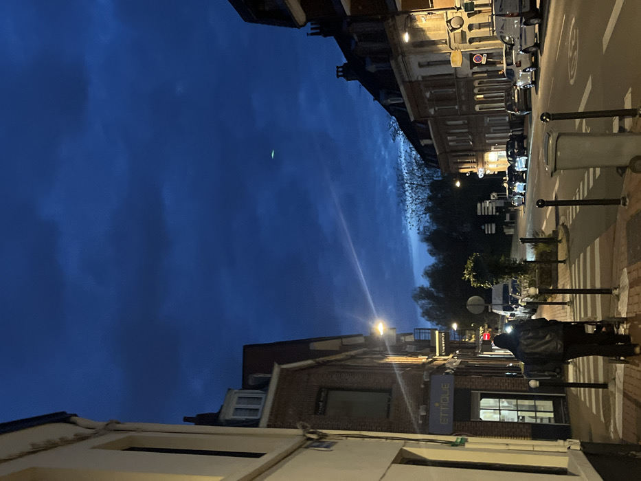 The image depicts a street scene in Croix, France, at dusk or nighttime, characterized by a dark blue, cloudy sky. In the foreground, a person is observed from behind, dressed in a dark hooded jacket and dark trousers, pushing a dark stroller or buggy. They are positioned on a brick-paved sidewalk, approaching a clearly marked white pedestrian crosswalk delineated by vertical black bollards. To the immediate left of the person, a cream-colored building partially frames the shot, next to a brick building with a reddish roof and dormer windows, featuring illuminated commercial signs for "ETTIQUE" and "L'INSTITUT" at ground level. The street, visible beyond the crosswalk, is asphalt and illuminated by streetlights, one of which shines brightly in the midground, casting a light streak upwards towards the sky. A light-colored, wheeled trash receptacle is situated on the right side of the crosswalk. Along the right side of the street, multiple parked vehicles, including sedans and at least one white van, are visible. In the background, a line of trees is discernible against the fading light of the sky. Various road signs are also present further down the street. A subtle, horizontally elongated green light anomaly or reflection is visible in the upper central portion of the dark sky.
