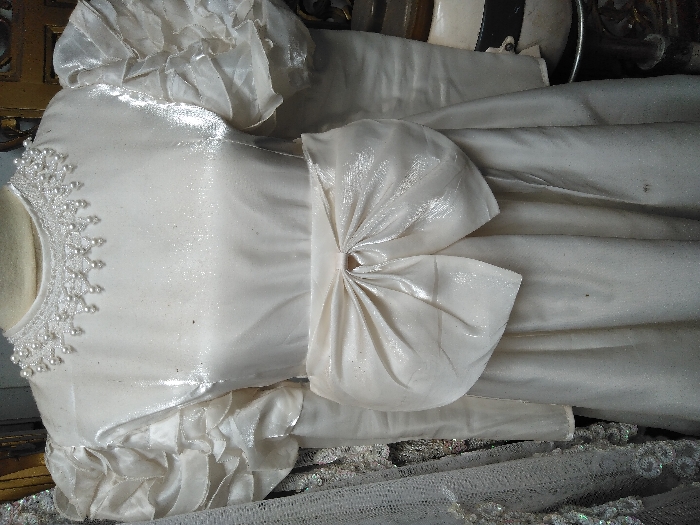 An off-white formal dress is displayed on a mannequin in an indoor setting in the city of La Leona, Venezuela. The dress is constructed from a shimmering fabric, possibly satin or organza, featuring a round neckline adorned with a pearl and lace-like trim, from which small white pearls dangle. The sleeves are voluminous at the shoulders, created by multiple ruffled or gathered layers, and extend into fitted long sleeves. A large, structured bow made of the same shimmering fabric is positioned at the front waistline. Small dark specks are visible on the dress fabric, primarily on the chest and lower front. Only the cream-colored neck and upper chest of the mannequin are visible. To the immediate left of the dress, a sheer white fabric with sequin or bead embellishments hangs. The background on the right is darker, revealing fragments of a wooden object with gold-colored trim and a white object with a dark horizontal band, possibly a ceramic container, resting on a metallic stand. No individuals are present.