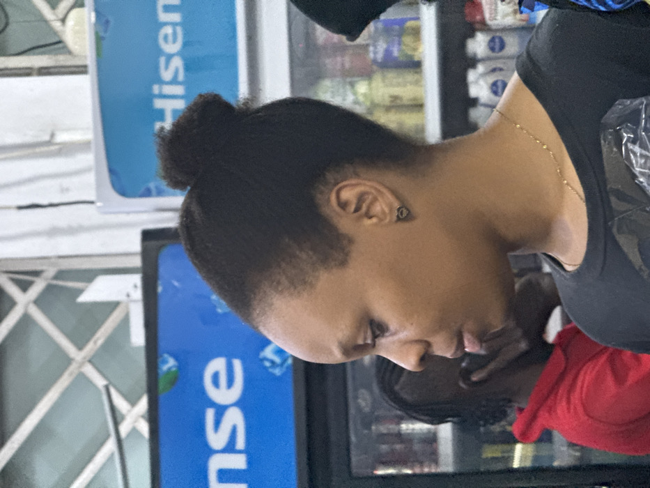 A side profile of a woman with dark hair styled in a bun. She wears a black top and a delicate gold chain necklace. Her gaze is directed downwards, and a subtle earring is visible. Another person wearing a red shirt is partially seen in the lower part of the image. The scene is set within a store, with a "Hisense" sign visible behind the woman, and refrigerated shelves with products lining the background.