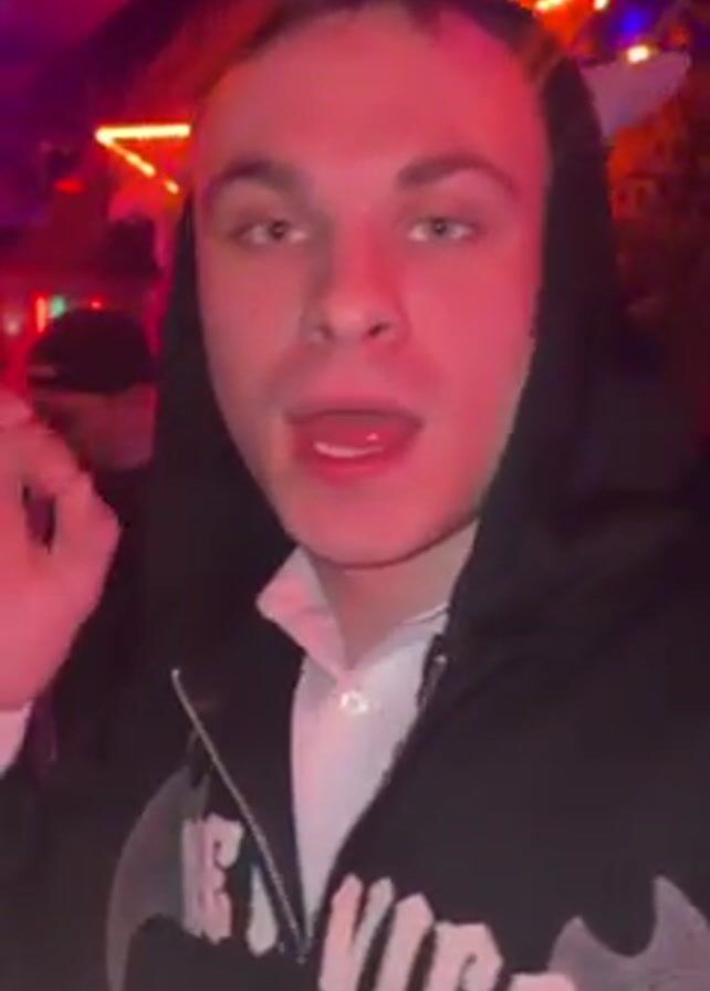 A young man in a hooded sweatshirt holds a bottle of Corona beer in his right hand and addresses the camera. He is indoors at what appears to be a party or club, with other people in the background. The space is lit with pink and blue lights. The man smiles for a brief moment at the start of the video, then speaks as he holds the beer up and shakes it a bit.