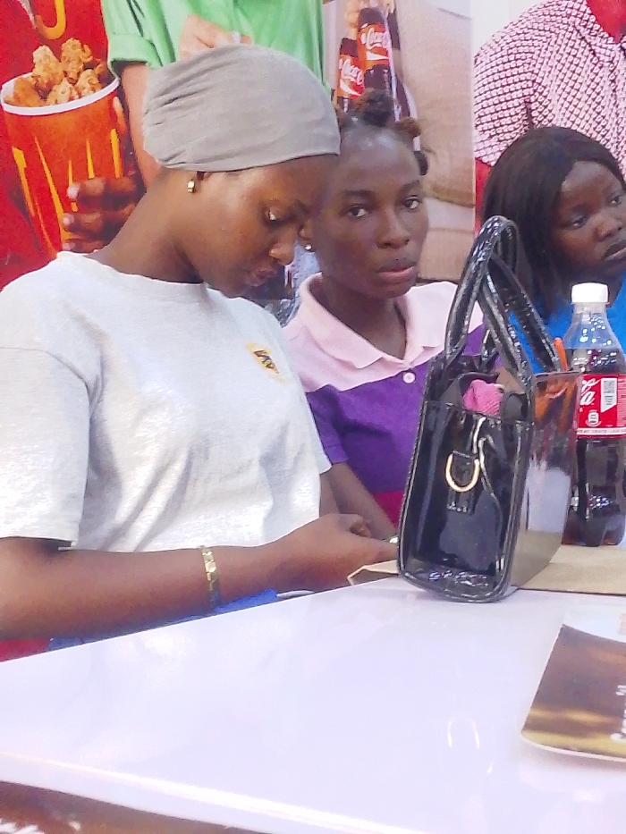 The scene depicts an interior setting in Giginyu, Nigeria, featuring three females seated at a white table. In the foreground left, a female with dark skin wears a light grey headwrap, a light grey short-sleeved t-shirt with a yellow emblem, a gold-colored earring on her right ear, and a gold-colored bracelet on her left wrist. Her head is bowed, directing her gaze downwards towards an unseen item on the table or in her hands. A blue object is partially visible under her left forearm. In the midground center, another female with dark skin and dark hair styled in small bun-like sections on her head wears a two-tone polo shirt with a light pink collar and a purple body; she looks directly forward. In the background right, a third female with dark skin is partially visible, wearing a blue top and looking downwards and to the right. On the white table in the foreground right, a shiny black handbag with a gold-colored D-ring accent stands upright, containing visible pink material. A plastic Coca-Cola bottle is partially visible behind the handbag. A small paper item or booklet lies on the table to the right. The background features multiple posters: one with a large orange cup filled with fried chicken, another displaying several Coca-Cola bottles, and a partial view of a person wearing a red and white checkered shirt.