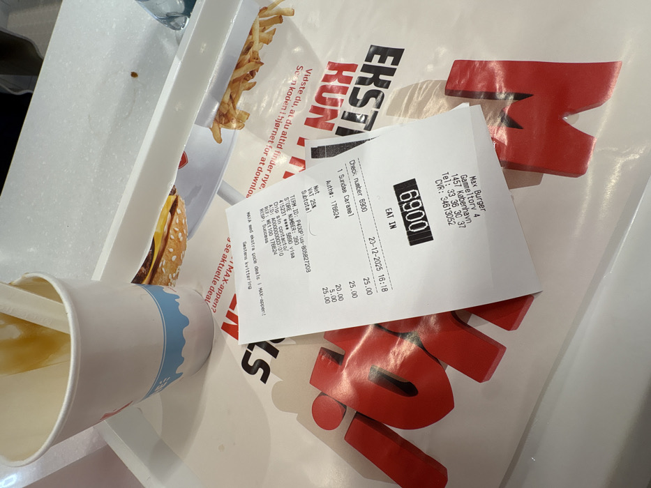 The image presents a forensic, close-up view of a white fast-food tray positioned on a light-colored table or counter. Dominating the foreground is a white, crumpled sales receipt from "Max Burger" located at "Gammeltorv 4, 1457 København, Denmark." The receipt is dated "20-12-2025" at "16:18" for an "EAT IN" order, detailing items including "1 Sundae Caramel" for 25.00, and indicates payment via a Visa card ending in 5690. To the upper left, a white paper cup with a light blue patterned base contains a partially consumed yellowish liquid and a white straw. The tray is lined with white paper featuring a red and black "MAX" logo and Danish text. Partially visible beneath the tray liner are fragments of a burger and a quantity of french fries, indicating remnants of a fast-food meal.