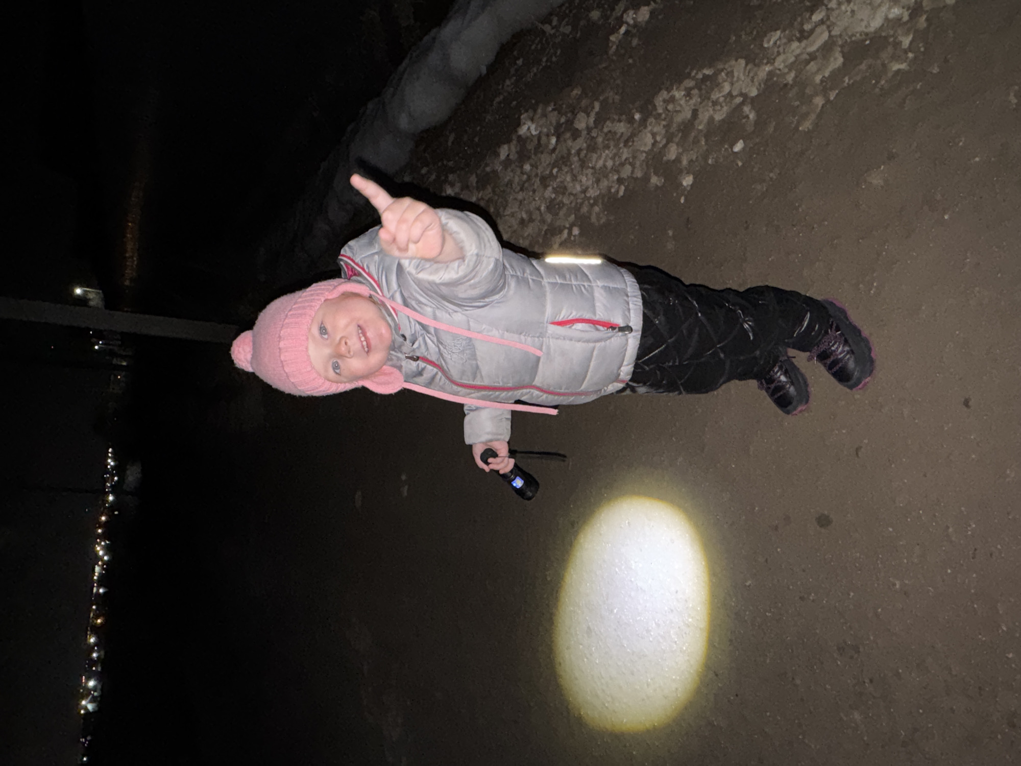 A photograph taken at night depicts a young child holding a flashlight in what appears to be an urban park-like environment. The child, wearing a pink knit hat, light grey puffer jacket, and dark quilted pants, shines the flashlight onto a concrete or paved surface. To the upper left of the child, there is what appears to be a bank or ledge with snow or ice. To the far left, there are faint string lights. The location is listed as Горный, Russia.