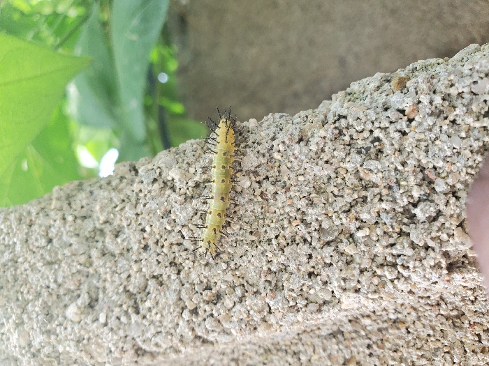 - "The scene, located in Akwanga, Nigeria, depicts a single light yellow-green caterpillar, approximately 3-4 centimeters in length, with distinctive black spiny projections along its segmented body" by FM-srCA33, licensed under CC BY 4.0