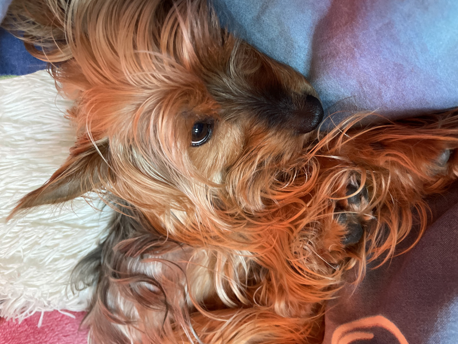A close-up image depicts a Yorkshire Terrier dog resting indoors in Cherven Bryag, Bulgaria. The dog is positioned on soft furnishings, with a white, shaggy textile visible in the upper background and a gradient blue-to-purple fabric beneath and to the right of the dog. A hint of pink fabric is present in the far upper left. The dog's fur is long and shaggy, predominantly reddish-brown and tan with darker brown coloration around its snout and eyes. Its dark eyes are open, with the right eye clearly visible, reflecting light and directed towards the camera. The dog's dark, wet-appearing nose is angled slightly downwards. One erect, pointed ear is visible towards the top center-left. Portions of the dog's paws are visible on the left side, exhibiting dark pads partially obscured by fur. The lighting is warm, enhancing the reddish tones of the fur. The dog appears calm and observant, making direct eye contact with the viewer. No other individuals or significant objects are discernible.