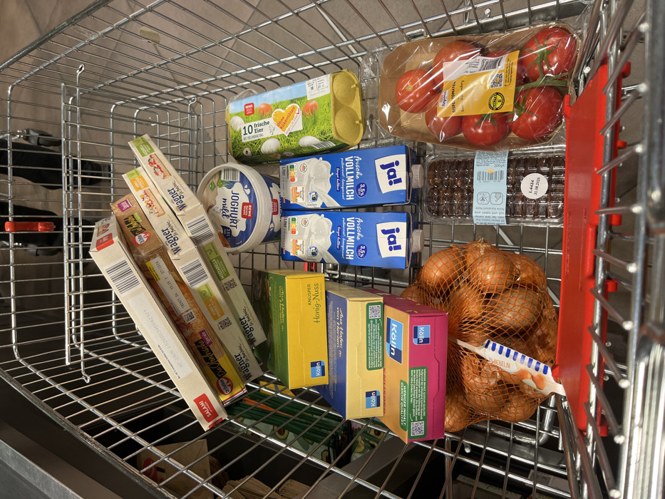A shopping cart contains assorted groceries. There are packages of Wagner's frozen pizzas, including salami and mozzarella flavors. Also present are tubs of Joghurt mild, cartons of ja! Vollmilch (whole milk), boxes of Kölln muesli (including Knusper Honig-Nuss), and a bag of onions. Additional items include a package of REWE "10 frische Eier" (10 fresh eggs), a pack of tomatoes, and a package of chocolate items with an expiration date of 30.08.2026.