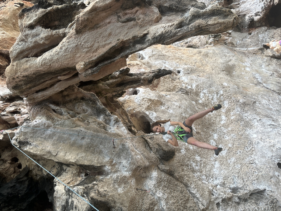 The image depicts an outdoor rock climbing scene at a limestone cliff in Tambon Ao Nang, Thailand